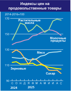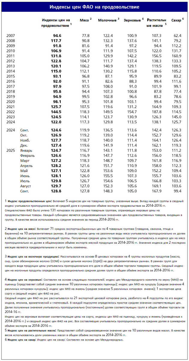 В сентября 2025 года среднее значение Индекса продовольственных цен ФАО (ИПЦФ) составило 128,8 пункта, что чуть ниже пересмотренного августовского показателя, когда его значение составляло 129,7 пункта. Снижение индексов цен на зерновые, молочную продукцию, сахар и растительные масла позволило компенсировать рост индекса цен на мясо. В целом значение ИПЦФ оказалось на 4,2 пункта (3,4 процента) выше показателя сентября 2024 года, однако оно все еще на 31,4 пункта (19,6 процента) ниже его рекордного значения, зафиксированного в марте 2022 года. В сентябре среднее значение Индекса цен на зерновые ФАО составило 105,0 пункта, что на 0,6 пункта (0,6 процента) ниже показателя августа и на 8,5 пункта (7,5 процента) ниже уровня сентября 2024 года. В сентябре третий месяц подряд продолжалось снижение мировых цен на пшеницу, в основном из-за ослабления международного спроса и подтвердившихся ожиданий обильного урожая в Российской Федерации и других ключевых странах-производителях в Европе и Северной Америке. Цены на кукурузу также снизились на фоне прогнозируемого значительного экспортного предложения со стороны Бразилии и Соединенных Штатов Америки, а дополнительное понижательное давление на котировки кукурузы оказала временная отмена экспортных пошлин на зерно в Аргентине. Что касается других фуражных зерновых, то мировые цены как на ячмень, так и на сорго выросли, причем цены на ячмень растут третий месяц подряд. Среднее значение Индекса цен ФАО на все виды риса в сентябре 2025 года снизилось на 0,5 процента, главным образом в результате снижения котировок индийских сортов: понижательное давление на рынок оказало наличие достаточного экспортного предложения и сокращение заказов на поставку со стороны покупателей на Филиппинах и в Африке. |