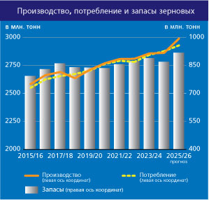 Исходя из текущих прогнозов мирового производства, запасы зерновых в 2025 году могут вырасти на 5,7 процента по сравнению уровнем начала сезона и достичь рекордного уровня в 916,3 млн тонн. Значительнее всего, как ожидается, вырастут запасы кукурузы, особенно в Северной Америке, а также пшеницы и ячменя, в то время как мировые запасы сорго могут несколько сократиться. На конец сезона 2025–2025 годов запасы риса в мире могут вырасти на 2,2 процента, достигнув нового пикового уровня в 215,4 млн тонн. В целом прогнозируется, что соотношение мировых запасов зерновых к их потреблению в сезоне 2025–2026 годов увеличится до 31,1 процента, что станет самым высоким показателем с сезона 2017–2018 годов.