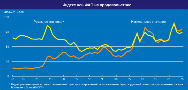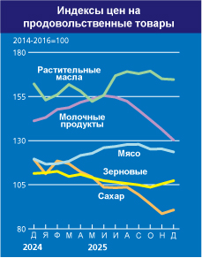 Среднее значение Индекса продовольственных цен ФАО (ИПЦФ) продолжило снижаться второй месяц подряд и в октябре 2025 года составило 126,4 пункта, что на 2,1 пункта (1,6 процента) ниже его пересмотренного сентябрьского уровня, составившего 128,5 пункта. Снижение значения индексов цен на зерновые, молочную продукцию, мясо и сахар с лихвой компенсировало рост значения Индекса цен на растительные масла. В целом, значение ИПЦФ оказалось несколько ниже уровня октября 2024 года и на 33,8 пункта (21,1 процента) ниже пикового значения, достигнутого им в марте 2022 года. Среднее значение Индекса цен на зерновые ФАО в октябре составило 103,6 пункта, что на 1,3 пункта (1,3 процента) ниже сентябрьского показателя и на 10,9 пункта (9,5 процента) ниже значения прошлого года. Было зафиксировано снижение мировых цен на все основные зерновые культуры по сравнению с уровнем предыдущего месяца. Среднее значение индекса цен на пшеницу сократилось на 1,0 процента, что в основном объясняется наличием достаточного предложения в мире, благоприятными видами на урожай в Южном полушарии, где идет уборочная страда, и стабильными темпами посевной кампании озимой пшеницы в Северном полушарии. Среднее значение индекса цен на фуражные зерновые по итогам октября снизилось на 1,1 процента на фоне снижения котировок ячменя, кукурузы и сорго. Понижательное давление на цены отчасти компенсировали данные о более низком урожае кукурузы в Европейском союзе и о вероятном сокращении урожая в Соединенных Штатах Америки, а также новости о заключенных торговых соглашениях между Китаем и Соединенными Штатами Америки. В октябре 2025 года среднее значение Индекса цен на все виды риса ФАО снизилось на 2,5 процента, что обусловлено обострением конкуренции за рынки сбыта и началом уборки основного урожая в ряде стран-экспортеров в Северном полушарии. В декабре 2025 года среднее значение Индекса продовольственных цен ФАО* (ИПЦФ) составило 124,3 пункта, что на 0,8 пункта (0,6 процента) ниже его ноябрьского показателя: снижение индексов цен на молочную продукцию, мясо и растительные масла с лихвой перекрыло рост индекса цен на зерновые и сахар. Значение индекса оказалось на 3,0 пункта (2,3 процента) ниже соответствующего показателя прошлого года и на целых 35,9 пункта (22,4 процента) ниже его пикового уровня, зафиксированного в марте 2022 года. По итогам 2025 год среднее значение данного индекса составило 127,2 пункта, что на 5,2 пункта (4,3 процента) выше показателей за 2024 год. Среднее значение Индекса цен на зерновые ФАО в декабре составило 107,3 пункта, что на 1,8 пункта (1,7 процента) выше уровня ноября. Что касается пшеницы, то опасения по поводу возможного срыва экспортных поставок из Черноморского региона оказали поддерживающий эффект на международные цены; при этом в целом предложение на рынках оставалось высоким, а подтвержденные данные о высоком урожае в Аргентине и Австралии усилили тенденцию к снижению цен. В то же время рост цен на кукурузу на международных рынках был обусловлен устойчивым экспортным спросом и активизацией производства этанола как в Бразилии, так и в Соединенных Штатах Америки, при этом цены на сорго росли параллельно с ценами на кукурузу, несмотря на снижение объемов закупок со стороны Китая – крупнейшего импортера сорго в мире. Значение Индекса цен на все виды риса ФАО выросло на 4,3 процента, причем рос