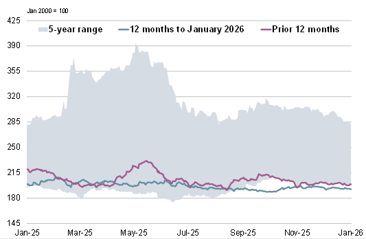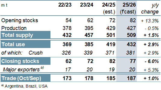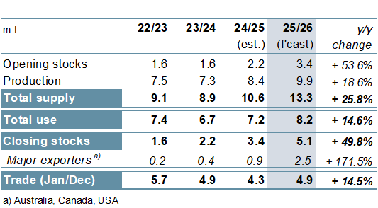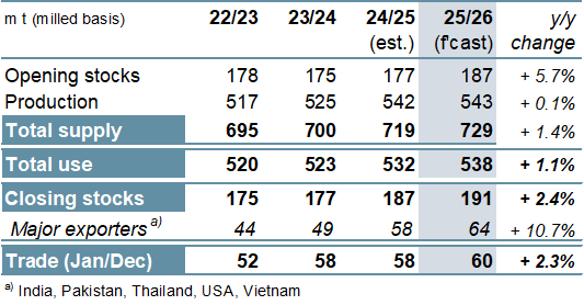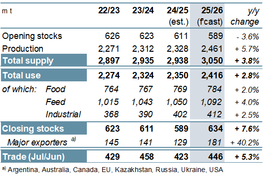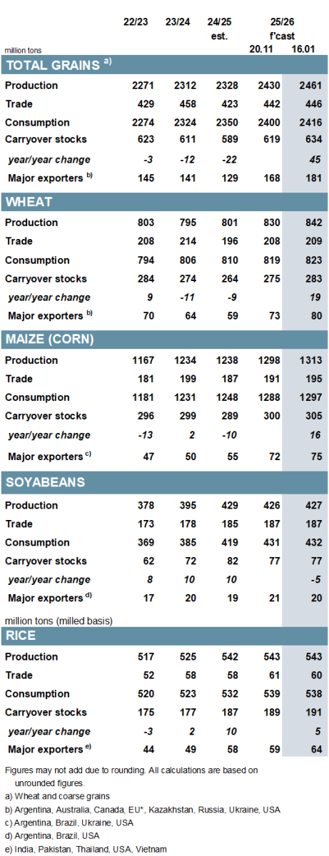 ОСНОВНЫЕ МОМЕНТЫ Производство всех видов зерновых (пшеницы и фуражного зерна) растет быстрее, чем прогнозировалось ранее. С учетом пересмотренных прогнозов по кукурузе (в основном в США и Китае), пшенице (Аргентина, Канада) и ячменю (Канада, Австралия) оценка мирового производства выросла на 31 млн т по сравнению с концом ноября и достигла рекордного уровня в 2461 млн т. Хотя дополнительные 16 млн т могут быть направлены на потребление, которое в настоящее время оценивается в 2416 млн т, почти столько же может быть добавлено к запасам на конец года, оцениваемым в 634 млн т (совокупный объем по соответствующим местным маркетинговым годам). Объем мировой торговли (июль/июнь) в настоящее время оценивается в 446 млн т, что на 4 млн т больше, чем в последнем прогнозе, и на 5% выше, чем в предыдущем году. Ожидается, что уборочная площадь пшеницы в 2026/27 году немного сократится, и исходя из средней продуктивности, урожай следующего года, по первоначальным прогнозам, снизится примерно на 2% в годовом исчислении. С учетом того, что спрос достиг нового пика, мировые запасы, по всей видимости, немного сократятся, но совокупные запасы у основных экспортеров останутся на комфортном уровне. По сравнению с ноябрем прогноз мирового производства соя-бобов практически не изменился и лишь немногим уступает пиковому уровню предыдущего года. Поскольку незначительное увеличение оценки предложения соответствует повышению прогноза мирового спроса, показатель совокупных переходящих запасов на конец сезона не изменился с прошлого выпуска обзора и составляет 77 млн т (-5 млн т), что выше среднего уровня. Прогноз торговли остается на уровне 187 млн т, что на 1% больше, чем в предыдущем году. Прогноз мирового производства риса практически не изменился по сравнению с прежней оценкой и составляет 543 млн т. В связи с небольшим снижением оценки потребления и ростом показателя переходящих запасов прогноз резервов на конец сезона 2025/26 г. увеличен на 2 млн т. Ожидания по торговле в 2026 году (январь/декабрь) несколько снижены, но ее объемы все равно останутся рекордными и составят 60 млн т (+2%). В основном под влиянием ослабления мировых экспортных цен на соя-бобы и пшеницу Индекс МСЗ по зерну и маслосеменам (GOI) недавно опустился до трехмесячного минимума. Благодаря более высокой урожайности (+5%) и расширению площадей (+1%), урожай всех видов зерна в 2025/26 году побьет все существующие рекорды, увеличившись на 6% по сравнению с предыдущим годом. Наряду с рекордными урожаями кукурузы и пшеницы, урожаи ячменя и сорго, как ожидается, также достигнут многолетнего максимума. Рост потребления на 3% будет более быстрым, чем обычно, в основном за счет ожидаемого значительного увеличения кормового использования. После трех последовательных сокращений запасы могут увеличиться на 8%, что потенциально станет самым быстрым темпом роста за девять лет. Сопоставимо активный рост прогнозируется у большинства крупных экспортеров, при этом совокупные переходящие запасы будут на 40% выше, чем в предыдущем году, и составят 181 млн т. Благодаря увеличению потоков пшеницы и кукурузы, объем торговли, по прогнозам, превысит средний показатель и составит 446 млн т (+5%). Мировое производство соя-бобов, по оценкам, составит 427 млн т, что лишь немногим ниже пикового показателя предыдущего года и значительно превышает нормальный